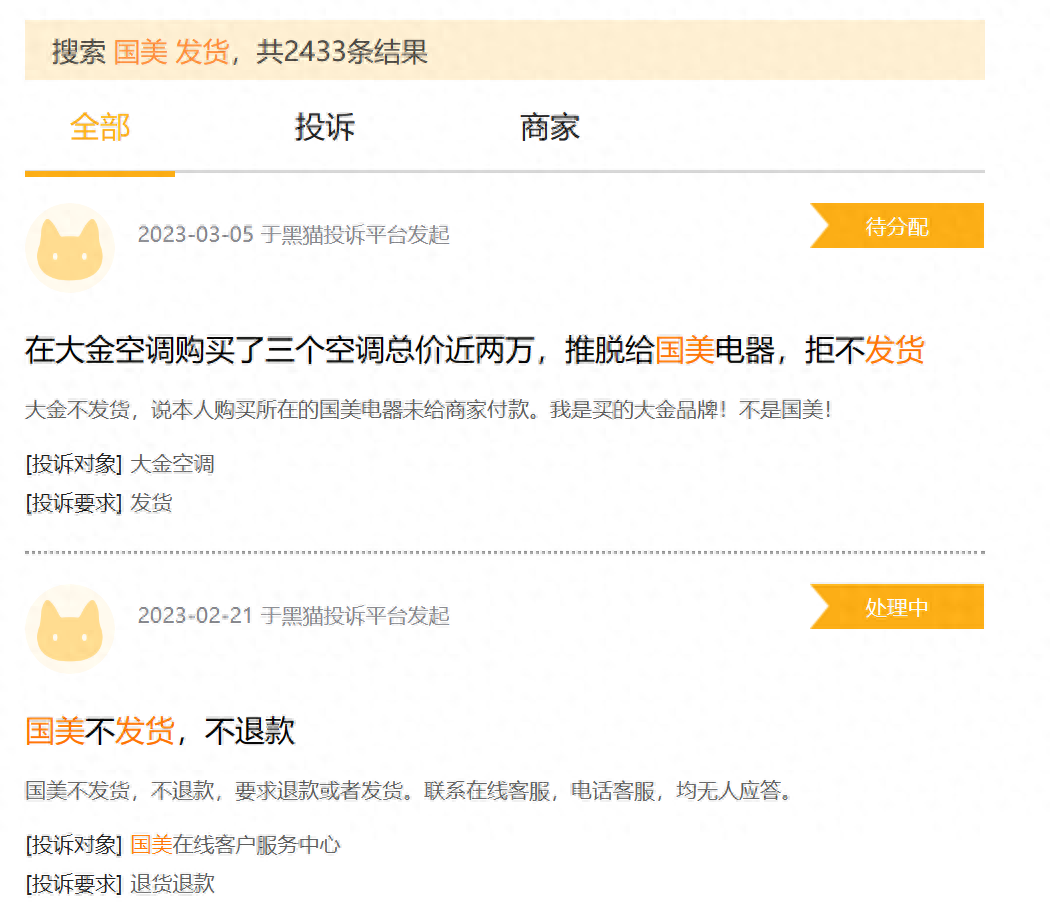 在黑猫投诉平台,关于“国美发货”的投诉共有2433条,其中大部分都与商品发货和退款有关,并且涉及全国多地。其中一些投诉处理结果显示“已回复”,但回复内容均已隐藏,无法查看。人民数据研究院通过梳理发现,从去年11月份开始,国美就出现了大量订单无法发货的情况。
