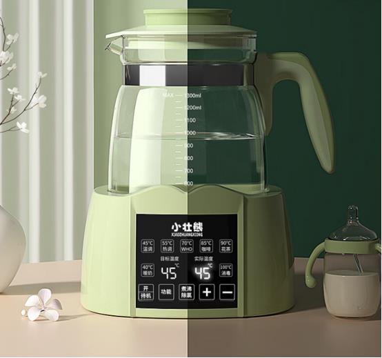 小壮熊它家这款恒温热水壶的外观采用了简约风格,清新抹茶绿配色非常清爽耐看,整体颜值高,杯体和底座采用的是分离设计,杯体拿取方便。