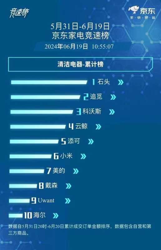 快科技6月19日消息,京东家电发布了最新的618清洁电器竞速排行榜,数据显示,从5月31日至6月19日期间,我国清洁电器的累计销售额排名中石头科技领跑,位居销售额榜首。