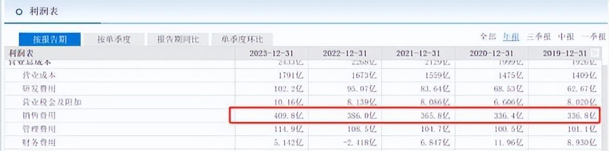 我们看到,海尔在销售费用上再次遥遥领先,2023年410亿几乎等于另2对手总和的80%,而营收只占它们总和的一半!