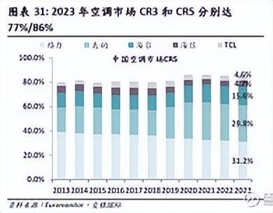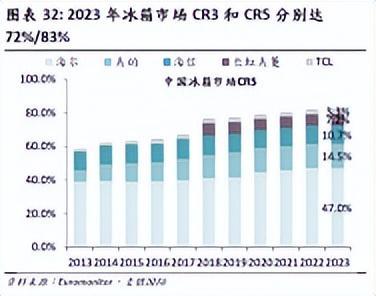 具体来看,①空调行业CR3较为稳定。自2015年后格力市场份额逐渐被美的系追赶,截至2023年末行业呈现格力、美的系市占率分别为31.2%和29.8%的双寡头格局;②冰箱市场CR3仍在逐年提升,海尔市占率由2013年的39%提升至2023年的47%,呈现一家独大局面;③洗衣机市场CR3呈现逐年提高趋势,截至2023年末海尔市占率50.8%,美的系市占率28.2%,双寡头间的市场份额差距较为明显。