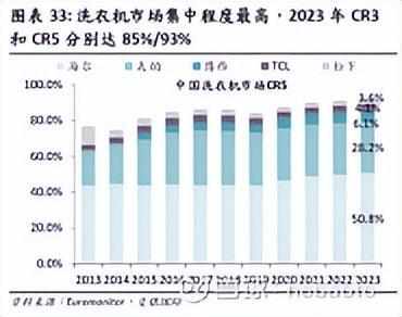 在行业竞争格局方面,一方面,从整体上看白电行业市场集中度高。2023年度空调、冰箱、洗衣机的CR3(前三大公司市场份额合计)都超过了70%。空调、冰箱、洗衣机的CR5分别高达约86%、83%和93%,龙头集中度持续提升。另一方面,不同品类的寡头竞争呈现不同格局。
