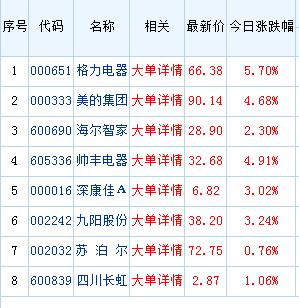 近日,随着电商的双十一活动带动家电产品的大卖,家电行业板块不断走强。从10月26日开始至11月6日,10个交易日,整体涨幅已达到4.78%。11月6日,家电板块虽然跌了0.28%,但是几个行业龙头仍是大涨,其中格力涨5.7%、美的涨4.68%、海尔涨2.3%,帅丰电器、深康佳A、九阳股份、苏泊尔等纷纷跟涨。