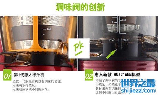 这一款榨汁机是惠人榨汁机的二代产品,可以说在惠人的榨汁机里属于极为经典的一款,销售价格大约为1699元,是惠人的突破型产品,在底部增加了一个调味阀门,可以增加水果的出汁率,以及极好的散热功能。