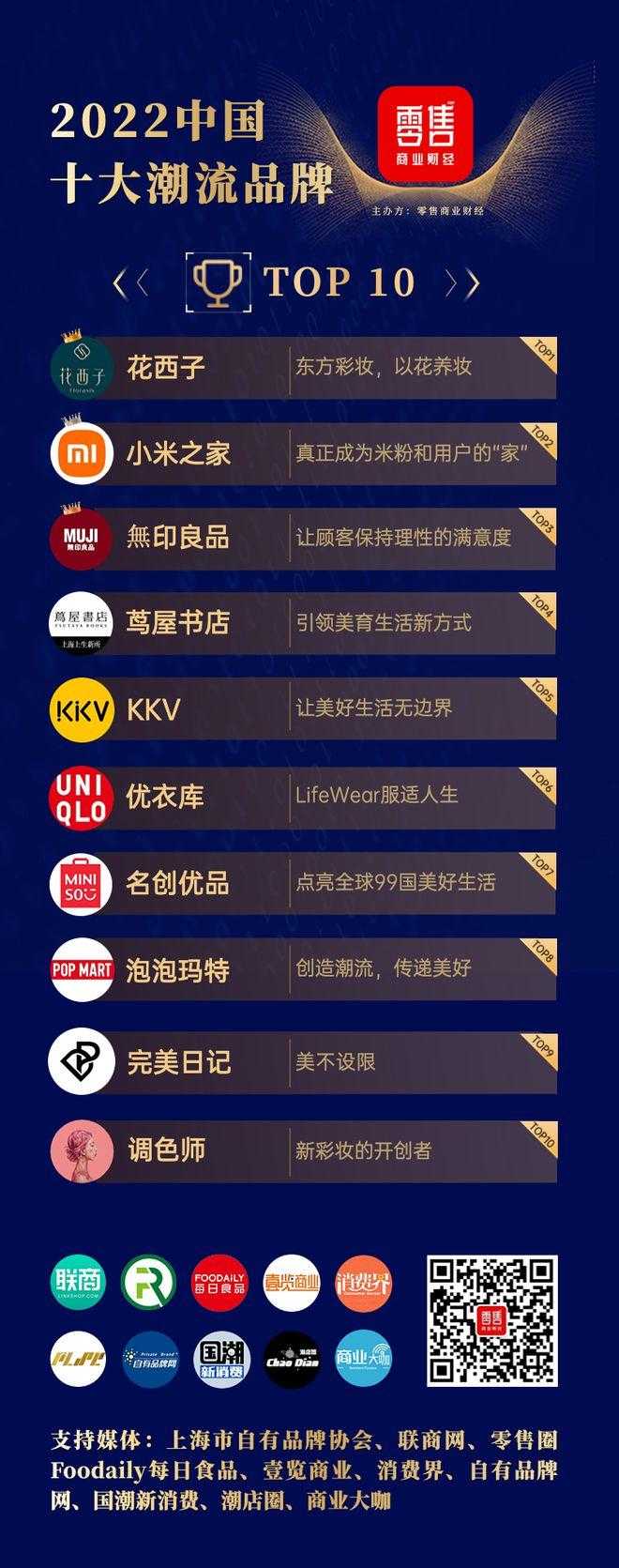 花西子、小米之家、無印良品、茑屋书店、KKV、优衣库、名创优品、泡泡玛特、完美日记、调色师获得“中国十大潮流品牌2022·Top10”称号。