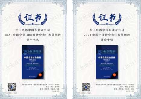 2021年12月3日,由中国社科院举办的“第十三届《企业社会责任蓝皮书》发布会”在京举办。在本次活动中,发布了最新的中国企业300强(国企、民企、外企)社会责任发展指数排名,松下电器取得了总排名第17位,外企第3名的优异评价。