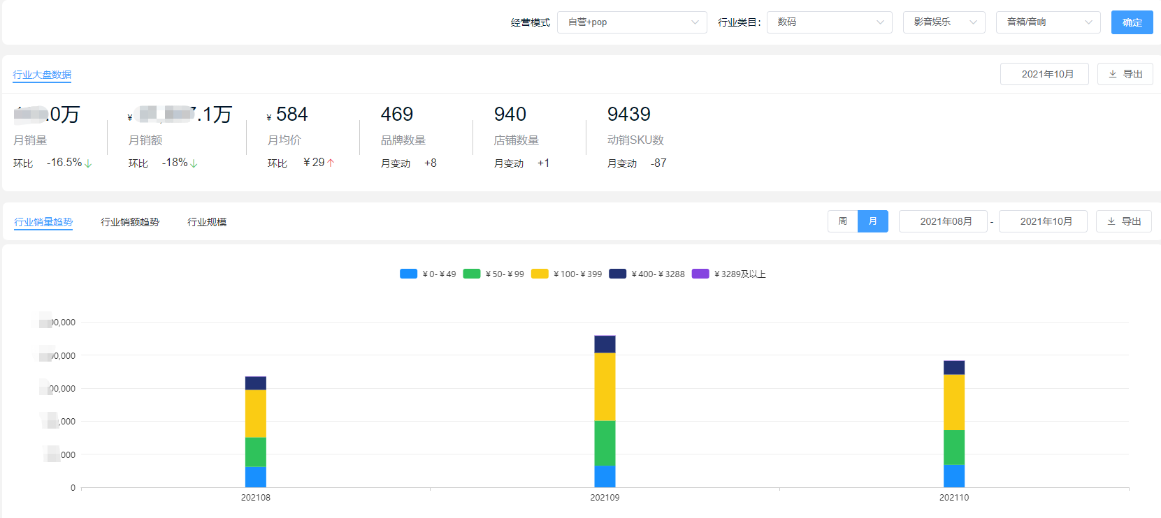 今年10月,京东平台智能音响月销量超110万件,销售额超2.7亿元。环比上个月有17%左右的下滑。目前,智能音响行业均价在580元左右,并且活跃的品牌数量、店铺数量和动销商品数都较大。