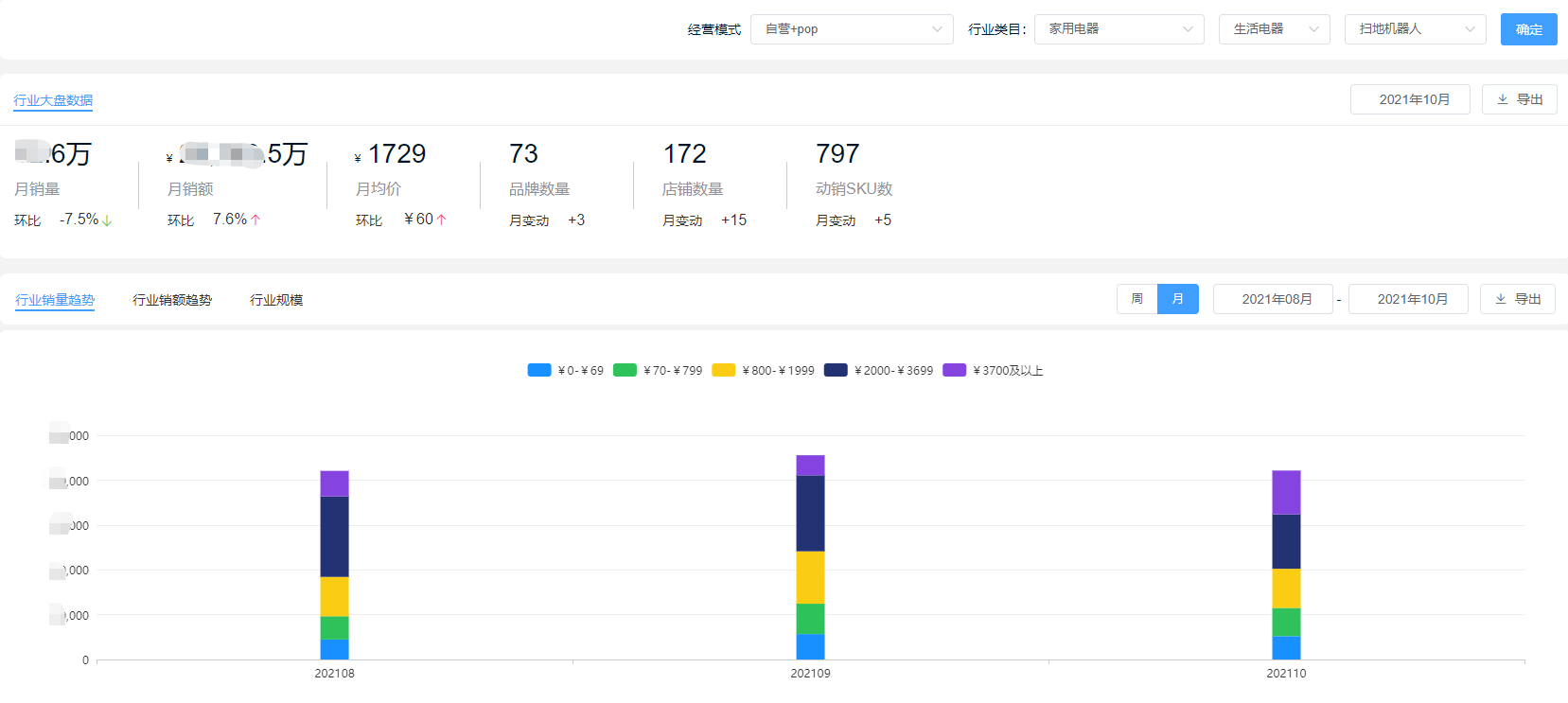 今年10月,京东平台扫地机器人销量超过12万件,销售额近3亿元,环比上个月上涨约7%。其次,目前行业整体均价在1700元左右,较上个月也有所上涨。