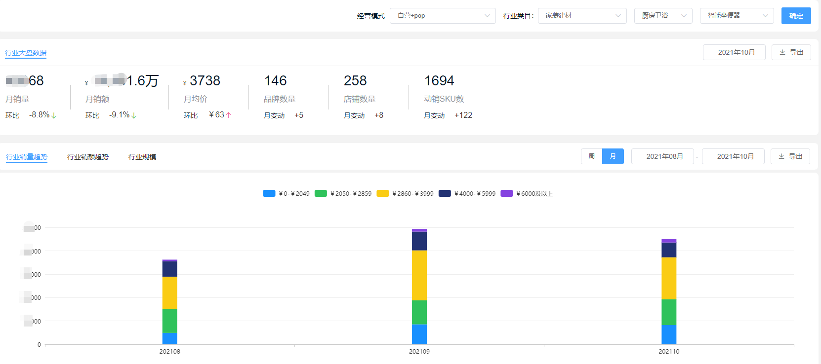 今年10月,京东平台智能马桶月销量约4.5万件,销售额超过1.4亿元。整体均价在3700元左右。整体市场发展较为稳定,与上个月相比变化不大。品牌数量、店铺数量也基本稳定在140个、250家左右。