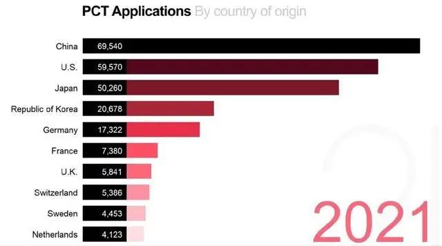特别值得指出的是,在2021年通过《专利合作条约》(PCT)途径提交的国际专利申请量上,中国再次位居世界第一,这是中国于2019年首次登顶以来,连续第3年蝉联榜首。据悉,2021年中国以6.9540万件的申请数量占据了全部申请量的四分之一强,也超过美国的5.9570万件和日本的5.0260万件,领跑全球创新。