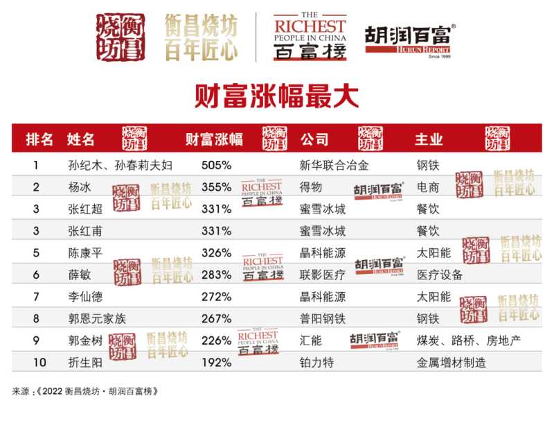 涨幅前十名企业家中,新华联合冶金的孙纪木、孙春莉夫妇和普阳钢铁的郭恩元家族,分别居第一名和第八名,均主营钢铁业务;晶科能源(688223.SH)的陈康平、李仙徳分别居第五和第七名,主营光伏业务。