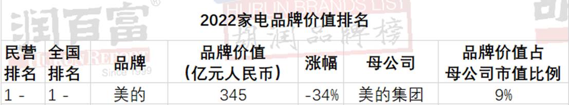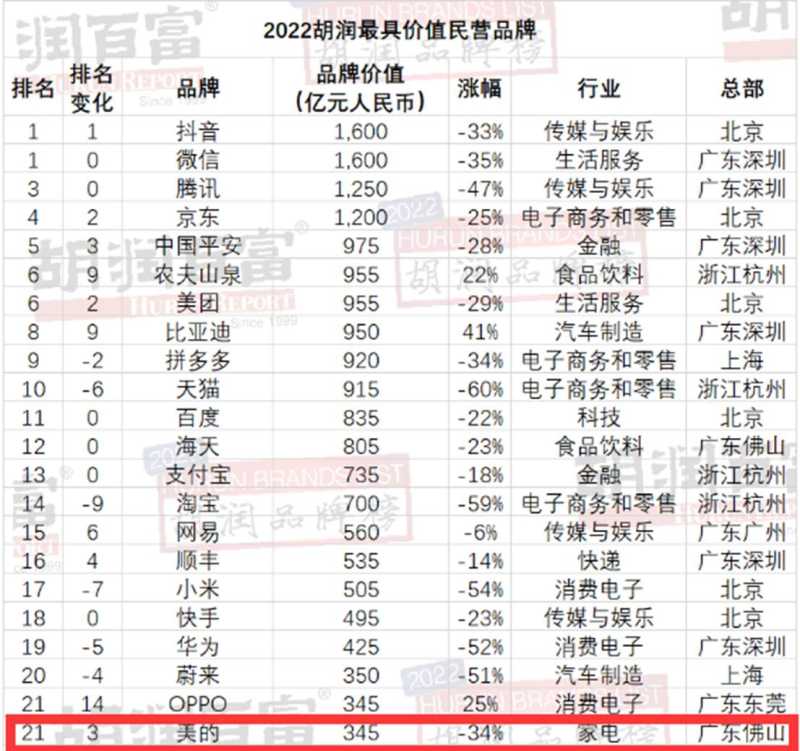 2022胡润品牌榜发布:美的在家电领域仍占据鳌头
