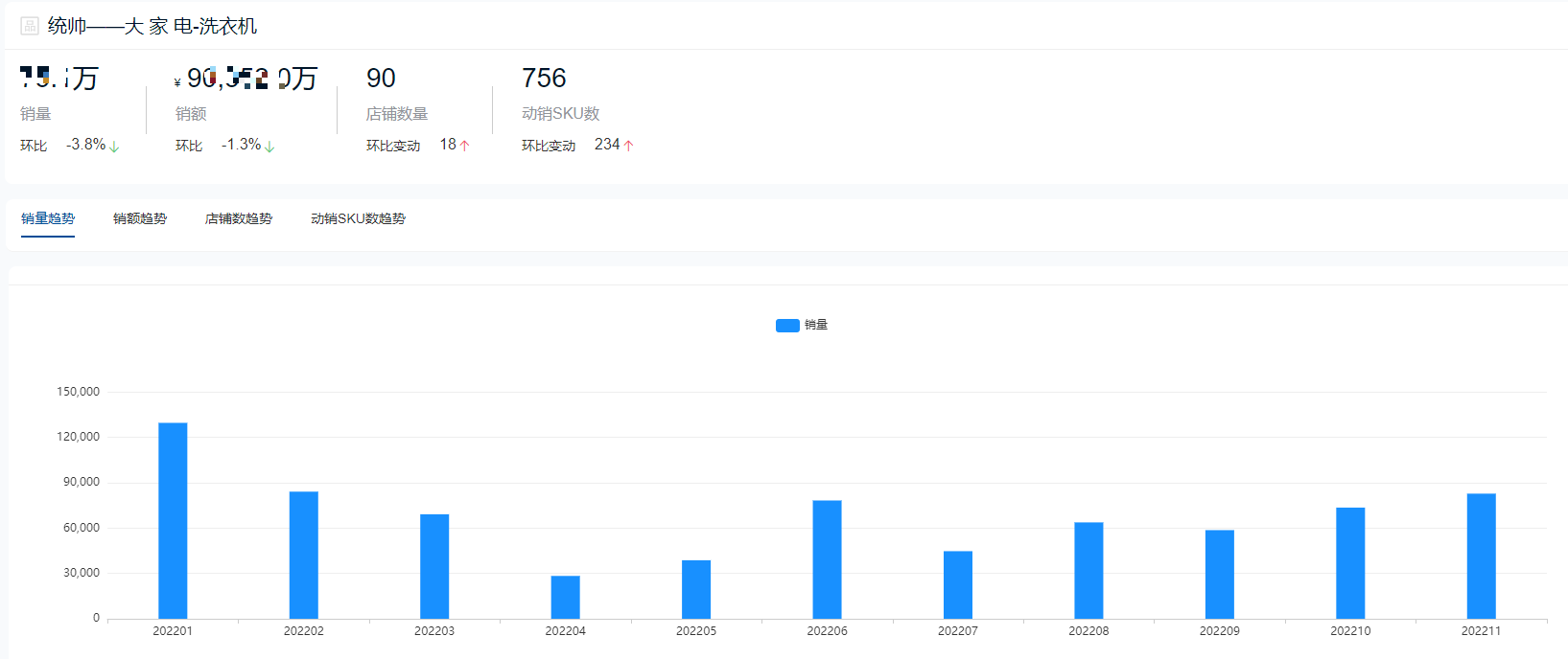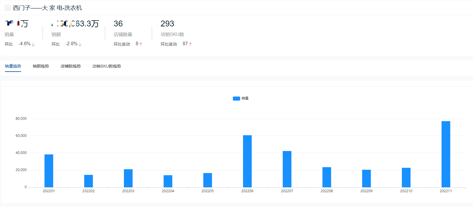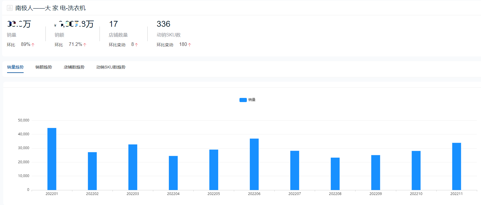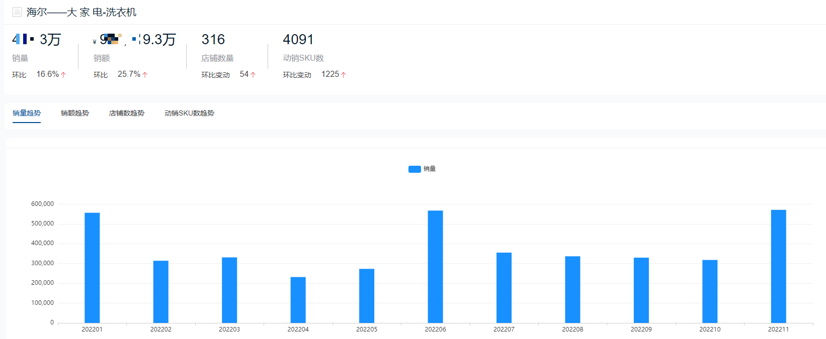 根据鲸参谋数据显示,2022年海尔品牌仍在洗衣机领域整体销售成绩排名第一,全年总销量将近420万件,总销售额超98亿元。今年11月份,海尔的销售成绩达到全年巅峰,单月销量超过57万件,销售额超过14亿元。目前在京东平台,海尔相关店铺超300家,每个月动销sku数量超过4000个。