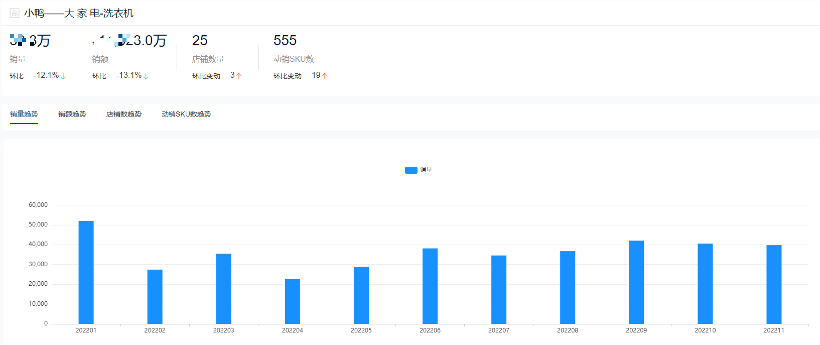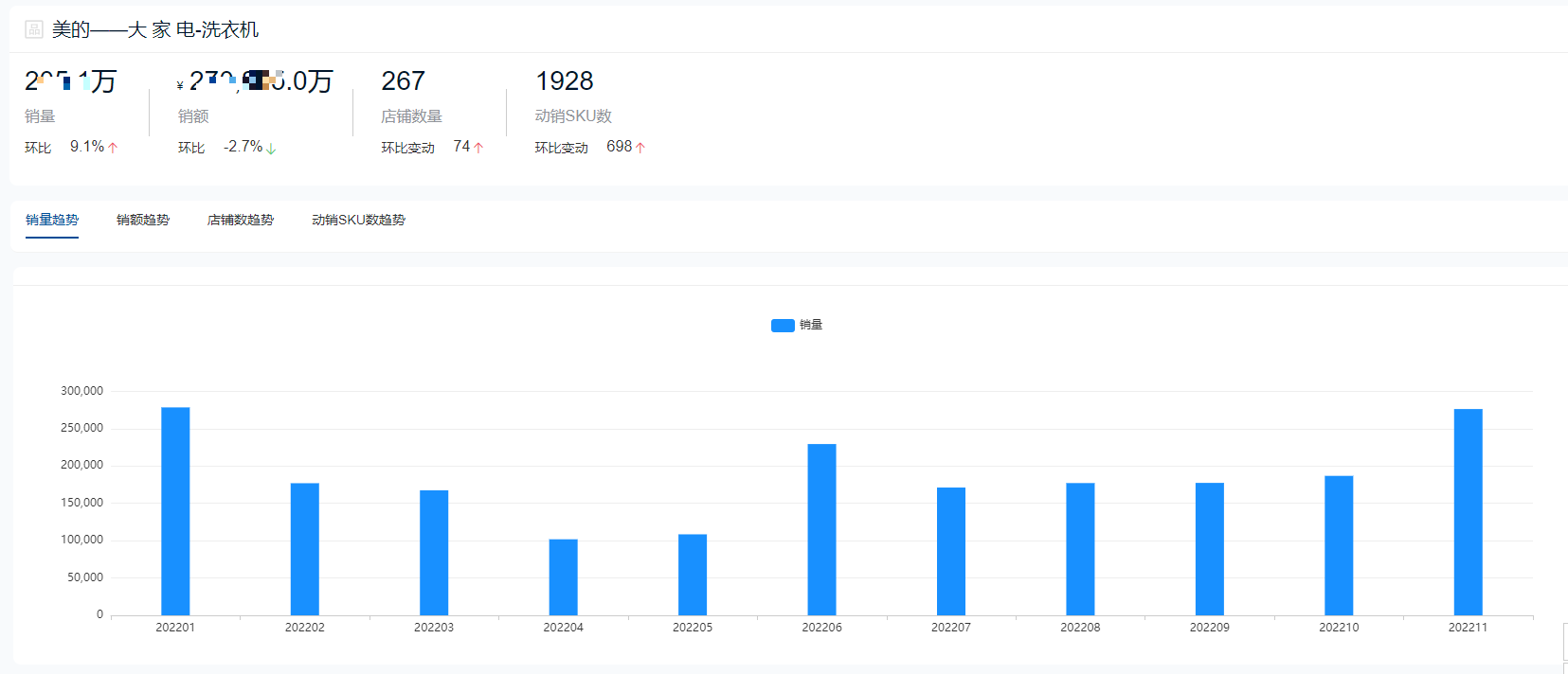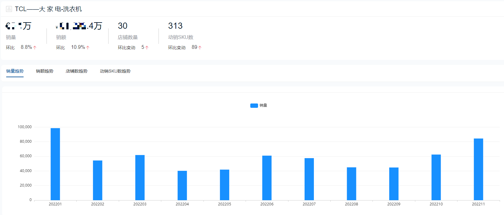 根据鲸参谋数据显示,2022年海尔品牌仍在洗衣机领域整体销售成绩排名第一,全年总销量将近420万件,总销售额超98亿元。今年11月份,海尔的销售成绩达到全年巅峰,单月销量超过57万件,销售额超过14亿元。目前在京东平台,海尔相关店铺超300家,每个月动销sku数量超过4000个。