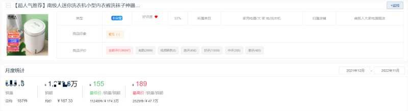 南极人的这款迷你小型洗衣机是南极人的热榜商品,今年在京东平台累计销售近7万件,累计销售额过千万元。该款产品历史最低价曾低至155元,最高为189元。