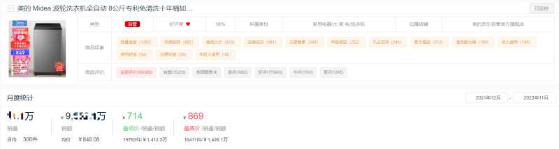 美的洗衣机中热榜第一的为这款“8公斤免清洗波轮全自动洗衣机”,今年在京东平台累计销售超11万件,累计销售额超9500万元。该款产品历史最低价曾低至714元,最高为869元。