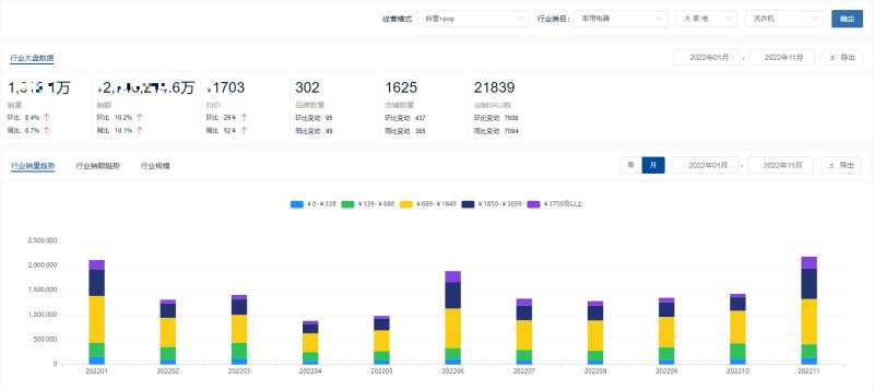 根据鲸参谋数据统计,今年京东平台洗衣机的年度累计销量达到1600多万件,同比增长约7%;累计销售额超过270亿元,同比增长约10%;今年(2022.4-2022.11)天猫平台洗衣机的累计销量约789万件,累计销售额约120亿元。