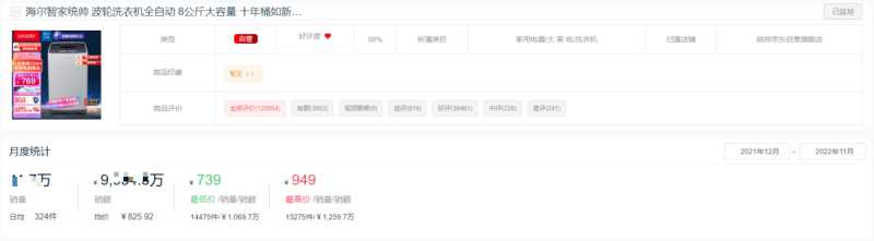 统帅的这款“8公斤大容量波轮洗衣机”为统帅热销商品中排名第一的产品。今年在京东平台累计销售超11万件,累计销售额近1亿元。该款产品历史最低价曾低至739元,最高为949元。