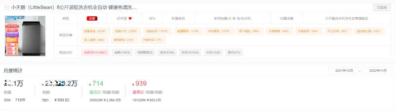 通过热销商品监控,我们统计到小天鹅最热销的商品一样是“8公斤波轮全自动洗衣机”,2022年在京东平台累计销售超26万件,累计销售额超2.3亿元。该款产品的历史最低价曾低至714元,最高为939元。