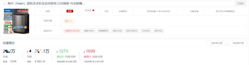今年,海尔的热榜商品“10KG大容量波轮洗衣机”在京东平台累计销售超26万件,累计销售额超4亿元。该款产品历史最低价曾低至1273元,最高为1699元。这款洗衣机标注的除螨功能也正符合当下人们追求健康生活的需求,因而也能越来越畅销。