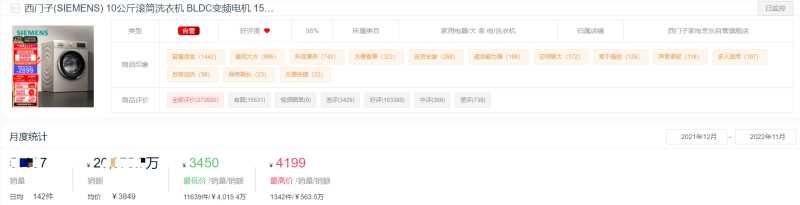 西门子的这款10公斤变频滚筒洗衣机比较受欢迎,今年京东平台上累计销量超5万件,累计销售额超2亿元。该款产品历史最低价曾低至3450元,最高价格达4199元。