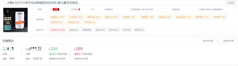 小鸭上榜的商品是4.5公斤小型半自动单桶迷你洗衣机,今年在京东平台累计销售超3.3万件,累计销售额超950万元。该款产品历史最低价曾低至234元,最高为298元。