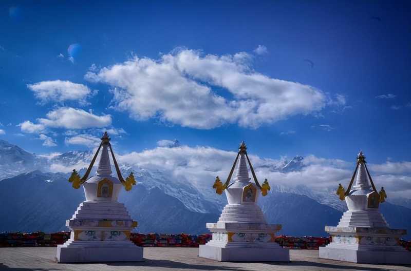 贡嘎雪山主峰7556米,是四川省内最高峰,被称为“蜀山之王”。藏语的“贡”是冰雪之意,“嘎”为白色,意为白色冰山。每当阳光高照,贡嘎雪山在阳光的照耀下泛着金色光芒,震撼而壮美,能让人将所有烦恼抛弃,被这绝美的景色治愈。