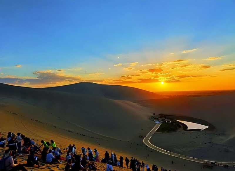 被誉为“塞外风光之一绝”的鸣沙山,山体由红、黄、绿、黑、白、五色细沙堆积而成,月牙泉地处鸣沙山的环抱之中,因形状酷似一弯新月而得名。千百年来,鸣沙山巅观日落,月牙泉畔心萧瑟,忆古思今皆蹉跎,浊酒一壶才逍遥,是敦煌的名片之一。并且,鸣沙山沙滩与泉水共存,是天空的镜子沙漠的眼,也是星星沐浴的乐园!