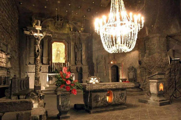 维利奇卡盐矿,位于波兰克拉科夫附近,是一个从13世纪起就开采的盐矿,已基本停产,变成了一个旅游胜地,盐矿中有房间、礼拜堂、盐雕和地下湖泊等,宛如一座地下城市。1978年被列为世界文化遗产。