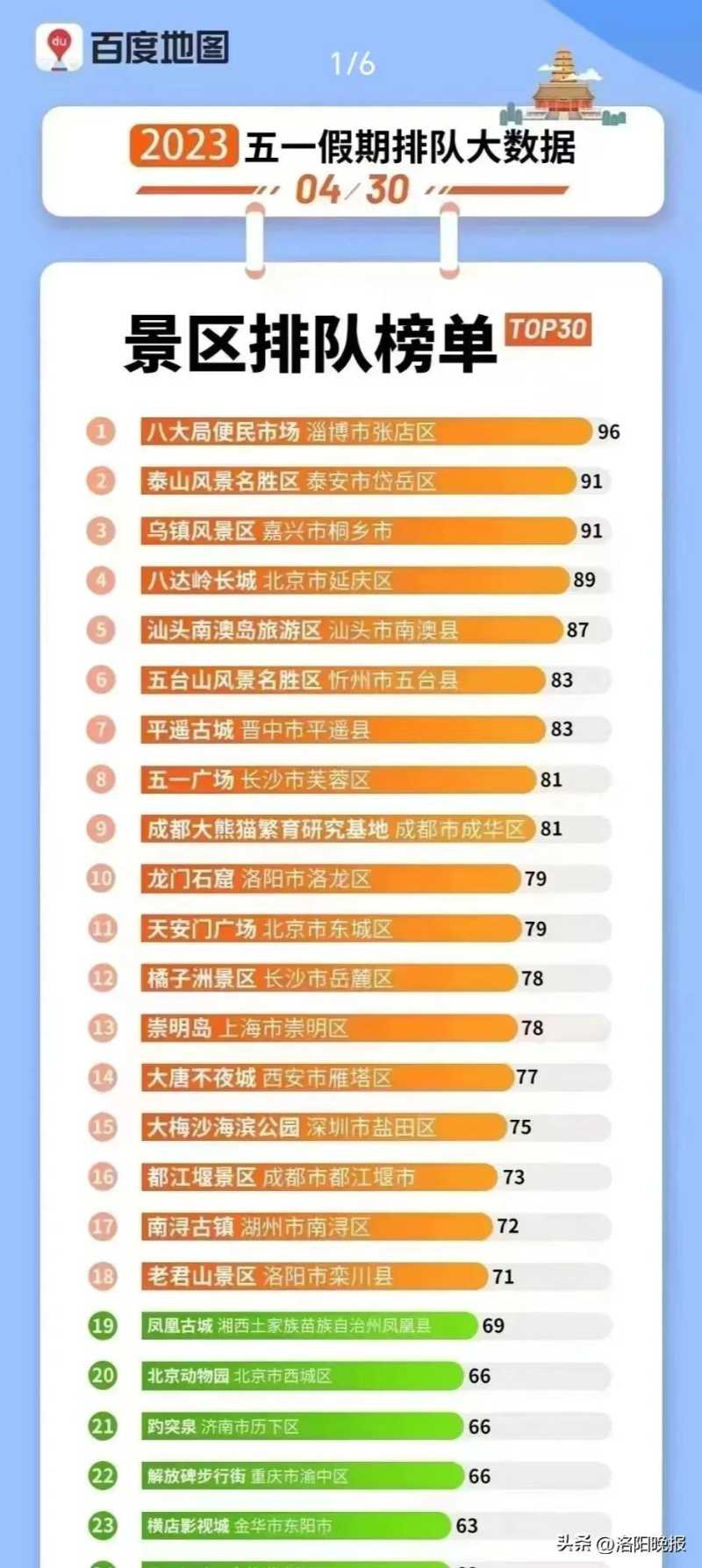 洛报融媒记者1日获悉,百度地图发布《五一景区热门排行榜》首日数据,洛阳龙门石窟、老君山景区上榜,分别排在第10位和第18位。