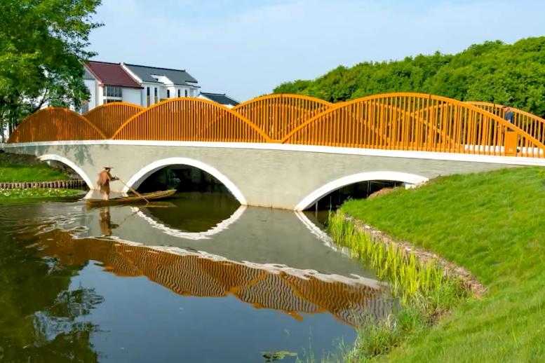 弯篓桥和鱼篓桥,仿照农家竹编鱼篓,设计了弧形的上盖,枝条横蔓、野趣盎然,又充满了现代感。