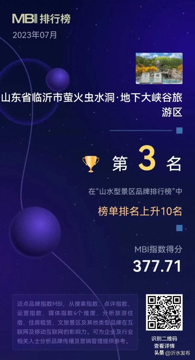 近日,“2023年7月5A级景区品牌传播力100强榜单“出炉,山东萤火虫水洞·地下大峡谷旅游区再次登榜,入围百强。