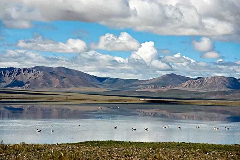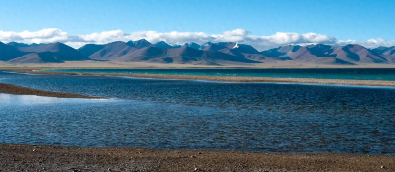 这里是西藏地区的三大圣湖之一,同时也是西藏地区第二大的湖泊,湖面如镜,倒映着蔚蓝的天空,仿佛与天空融为一体,纯洁自然,远处还屹立着唐古拉山脉。