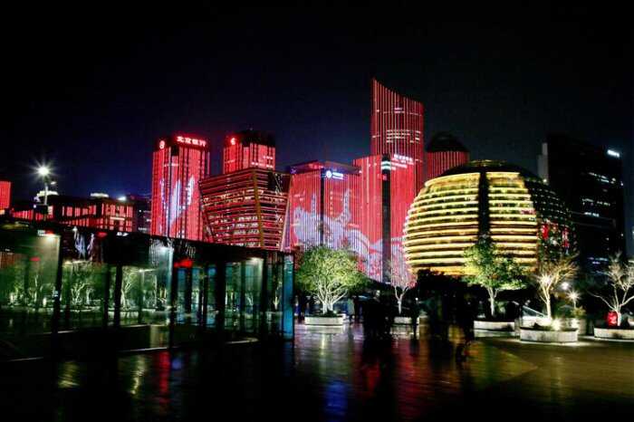 位于浙江省杭州市江千区,钱江新城最有名的就是夜晚的灯光秀,是游客到杭州夜游必选项目之一了。灯光秀由70万盏LED灯组成,分别安装在钱江新城核心区沿岸的30栋高层建筑外立面上,运用吉、光、电等视觉效果,搭配大型音乐,配上自然山水、人文、建筑及杭州logo等元素,呈现一幅幅具有“中国气派、江南韵味”的画卷。