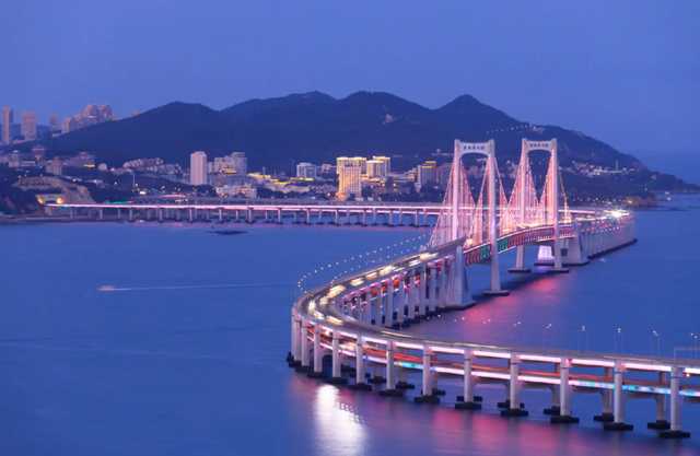 星海湾大桥位于辽宁省大连市,全长约6公里,主桥820米,主跨460米,两个边跨分别为180米。大桥的灯光和彩灯的夜景很美。站在远处远远望去,在桥周围灯光的照射下,依然可以清晰地看到灯光和景物在海中的倒影。太美了。看看桥上的灯光和风景。色彩斑斓的大连星海湾大桥是大连夜游后必去的地方之一。