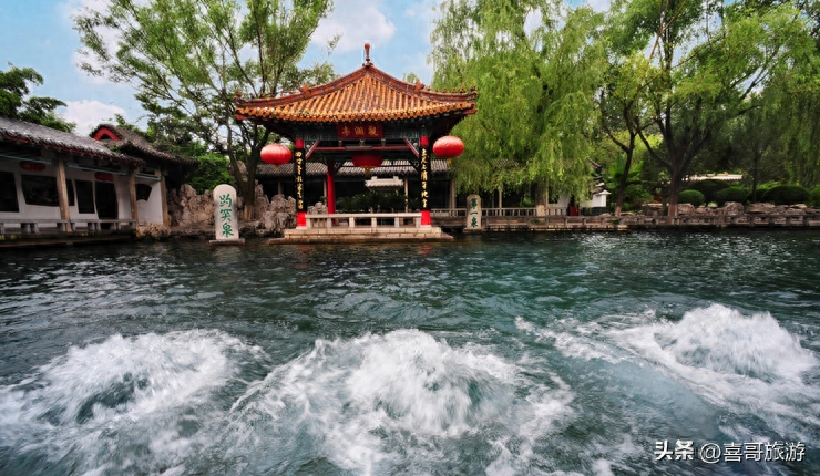 趵突泉,是位于山东省济南市历下区趵突泉南路1号的一个著名景点,济南三大名胜之一,面积达158亩,位居济南七十二名泉之冠。乾隆皇帝南巡时因趵突泉水泡茶味醇甘美,曾册封趵突泉为“天下第一泉”。也是最早见于古代文献的济南名泉。趵突泉泉眼位于趵突泉公园内的泺源堂前。民国二十年(1931年)四周用石砌岸。几经变化,形成长方形泉池,长30米,宽18米,深2.2米。北临泺源堂,西傍观澜亭,东架来鹤桥,南有长廊围合。泉水从地下石灰岩溶洞中涌出,每天涌出7万立方米泉水,泉水有三个出水口,最大涌水量为16.2万立方米/天。趵突泉水一年四季恒定在18℃左右。趵突泉周边的名胜古迹有泺源堂、观澜亭、尚志堂、李清照纪念堂、李苦禅纪念馆等景点。趵突泉与千佛山、大明湖并称为济南三大名胜。