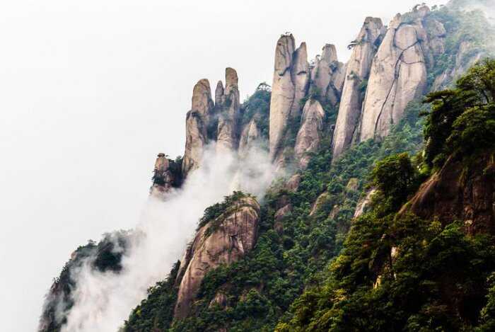 三清山展示了世界上已知花岗岩地貌中分布最密集、形态最多样的峰林,山势是东、南、西三面陡峻,北面平缓,地势高差很大。从整体看,东坡从金沙至玉京峰,西坡从横坦、汾水至玉京峰,恰为两个相靠的凹球面,它们与南部的凸球面合成高耸入云、层峦叠峰的奇特地貌。东坡比西坡平缓,南坡又比东坡平缓。组成三清山主体的岩石为燕山晚期花岗岩,其中边缘相和过渡相的花岗岩是构成三清山峰峦的主要岩石,近谷底则多为内部相的中粗粒斑状、似斑状黑云母花岗岩,因其极易风化剥蚀,故多形成稍缓地形。