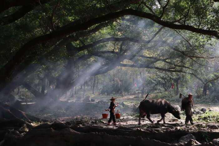 景色优美的杨家溪,保留着上百年的古榕树群,在榕枫公园枝繁叶茂的老榕树下,老汉牵牛缓缓走过,还有农家大姐赶着鹅在树下走过,阳光透过树荫洒下来,晨雾弥漫,勾勒出一幅醉人的画卷,拍照绝美!