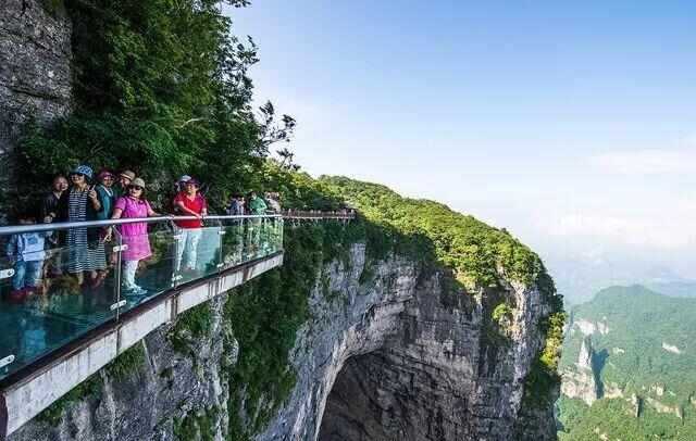 天门山的山顶有一个美丽的天然拱门,到达山顶的方法之一是步行,这条小路的一部分穿过了一条狭窄而可怕的悬崖小路,就像下面这张照片里的样子,这条步道的一些部分是用透明玻璃制成的,这让这种体验更加可怕。