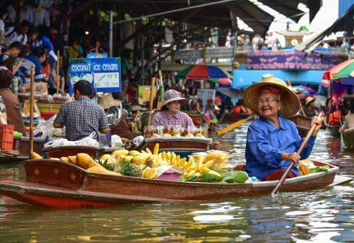 水上市场是一种商品市场,主要是水果、蔬菜和泰式熟食。你可以乘坐导览船在狭窄的运河里游弋,即使市场上挤满了游客,那里的氛围也很棒。