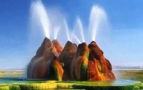 飞翔的喷泉位于美国内华达州黑岩沙漠内古湖的干涸湖床,那里有众多的间歇喷泉。象火山爆发和地震一样,间歇喷泉和温泉等都是隐匿于地表之下巨大能量的释放窗口。高高的锥形喷泉口是由于泉水喷出时所携带的矿物质硬化累积而成,现在仍继续累积升高。随着季节的变化和水量的增减,颜色各有不同,宛如人间仙境。