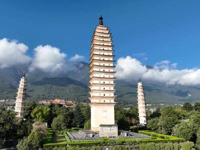 崇圣寺三塔位于大理古城西北部1.5公里处,是大理国时期的皇家寺院。现今的崇圣寺是规模宏大,气势磅礴。三塔鼎立,主塔名为千寻塔,高69.13米,共有16层。南北两侧各有一小塔,与主塔相映成趣。当阳光照射在三塔上,塔身熠熠生辉,蔚为壮观。此外,塔后还有一个湖泊,三塔的倒影映照在湖水中,构成了一幅美丽的画卷。