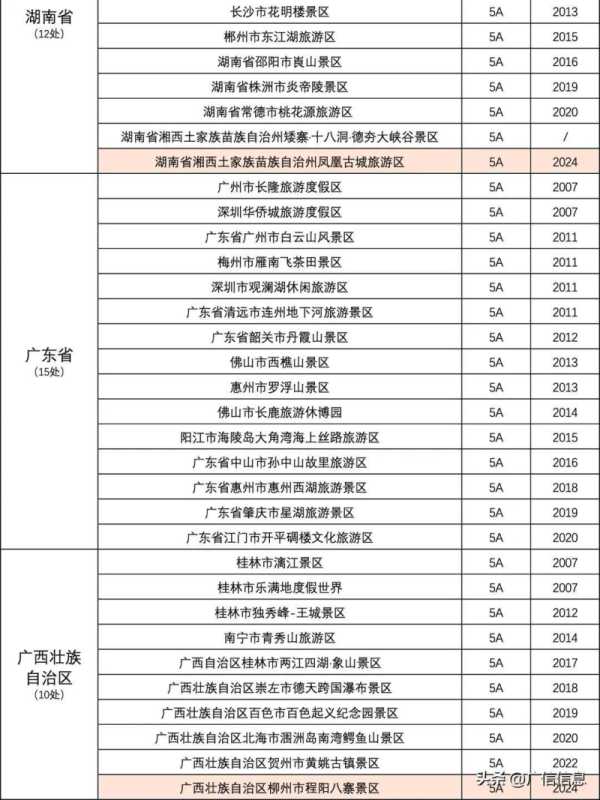 广东有5A景区15个,排名第8。湖南有5A景区12个,排名第12。广西有5A景区10个,排名第18。