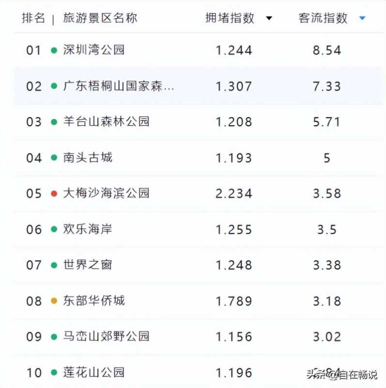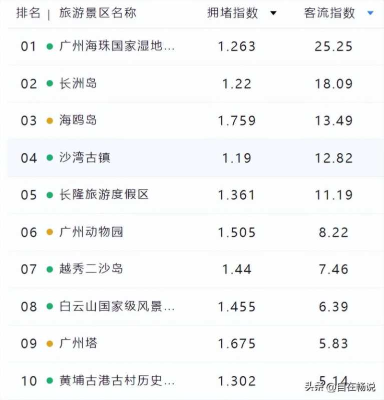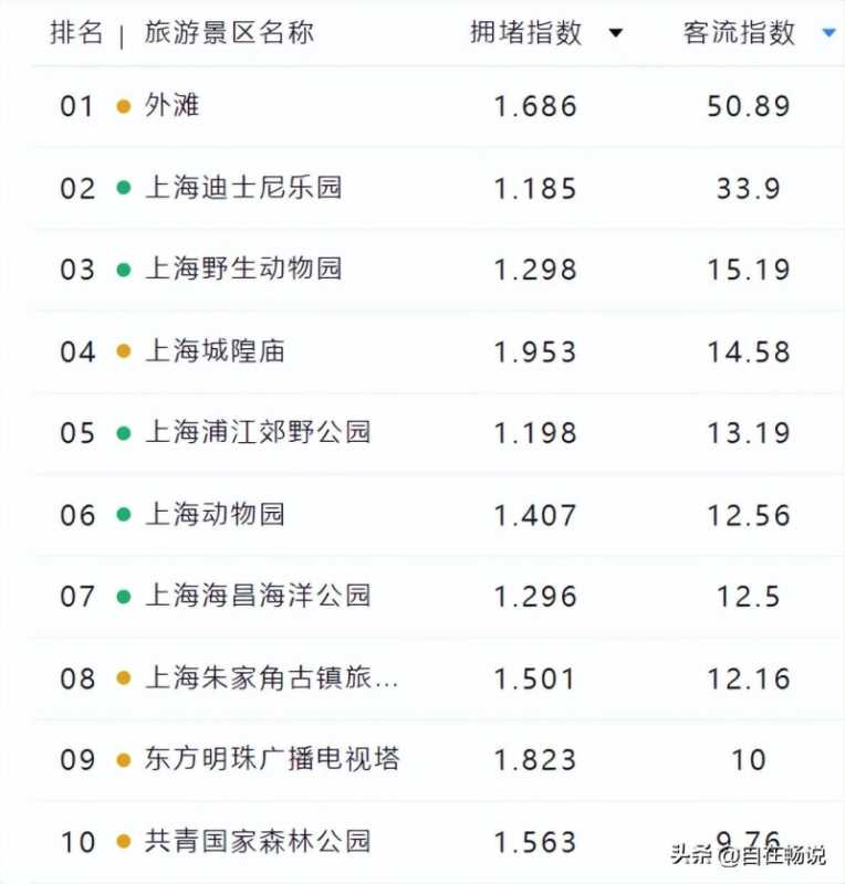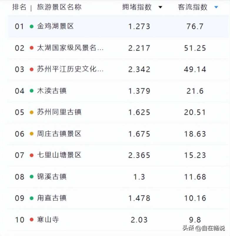 客流指数排名前十景区