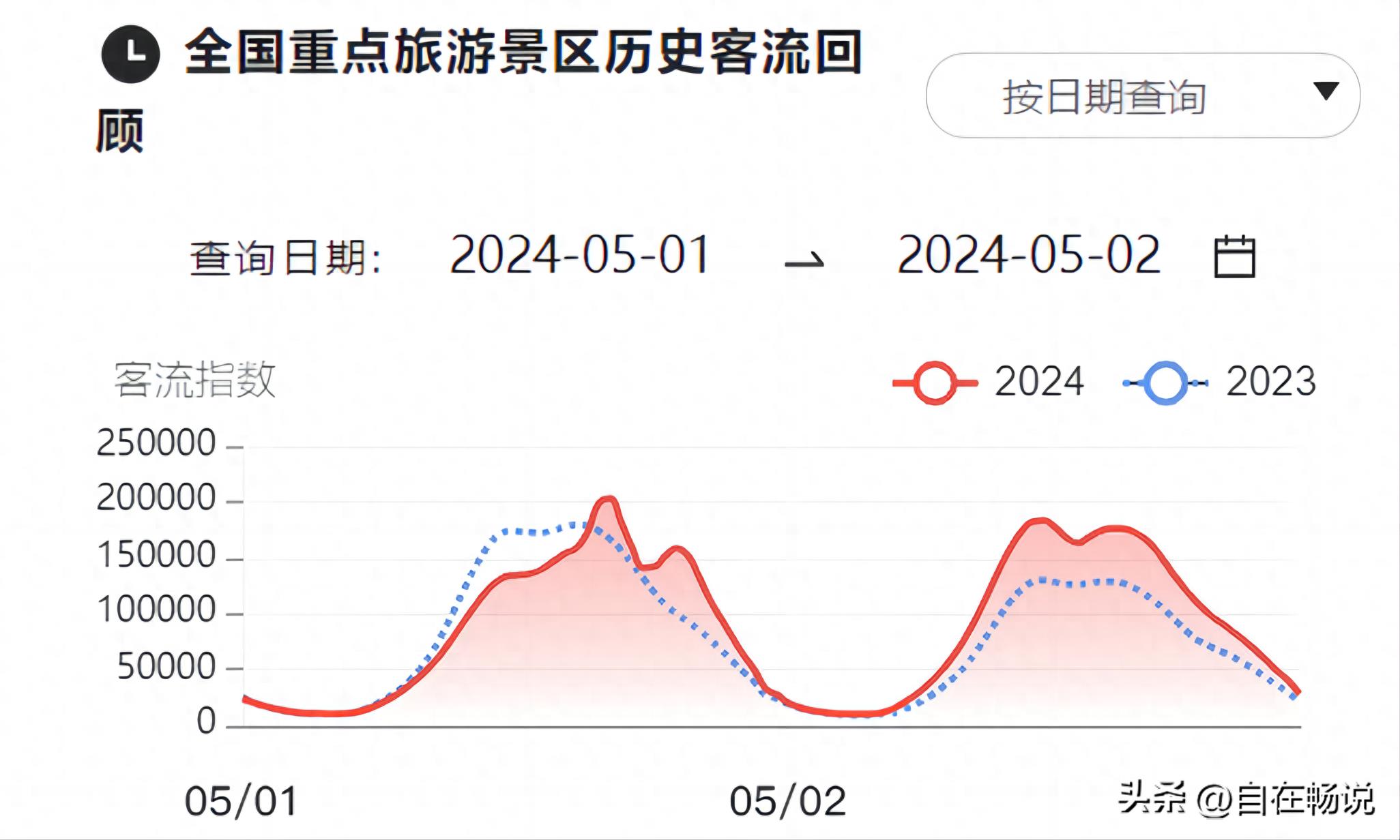 2024年05月01日-2024年05月02日,全国重点旅游景区的平均客流指数为88755.56,较去年同期上升16.83%;2024年05月01日16:30出现全国重点旅游景区的客流指数峰值203139.56。