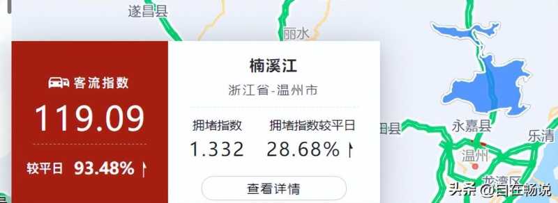 5月1日-5月2日,景区客流排名第五的是温州市楠溪江,客流指数达到119.09,较平日增长593.48%