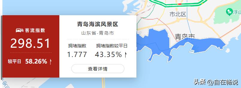 5月1日-5月2日,景区客流排名第一的是青岛海滨风景区,客流指数达到298.51,较平日增长58.26%