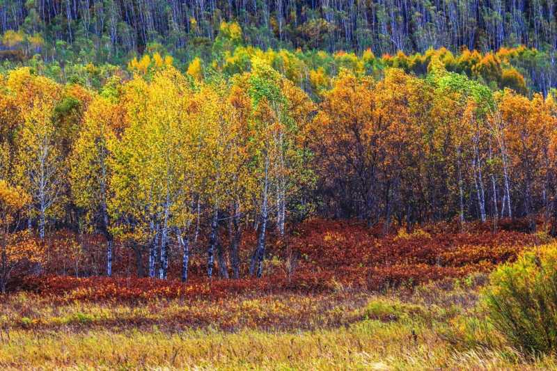 5. 黑龙江大兴安岭:秋天的大兴安岭是一片金色的海洋,落叶松、白桦树等树木的叶子变得金黄,森林仿佛被撒上了一层金色的颜料。