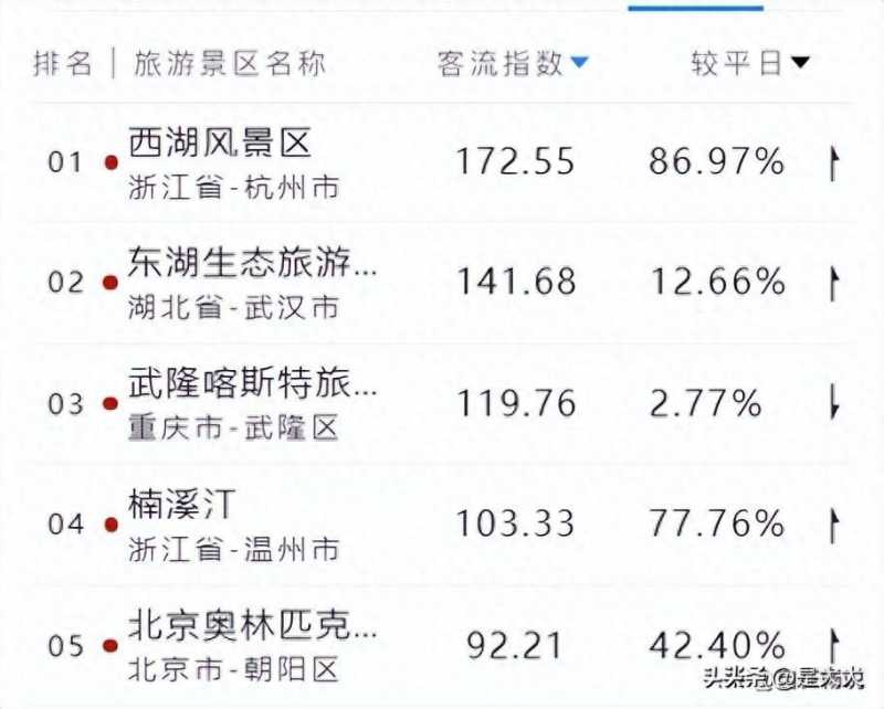 还有不少的景区也精彩亮相!湖北武汉的东湖生态旅游风景区,也以14168的客流指数排在了第二位,增长了1266%!兄弟们,你们知道吗,东湖不止是一片湖,还藏着丰富的自然资源和人文历史,吸引了一波又一波的游客,湖边慢步,或是骑车环湖,感觉都能享受到这份悠闲,简直是放松心情的绝佳选择