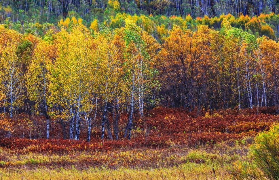 大兴安岭的秋景也不赖,漫山遍野的落叶松,金黄一片,美得不要不要的。清早起来看日出,阳光透过树林,那感觉,绝了!